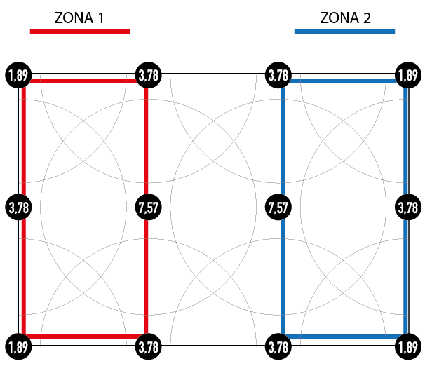 Avremo quindi un impianto a 2 zone con ogni zona che ha una portata di 22,5 l/min, perfettamente gestibili dal nostro impianto idrico con portata di 33 l/min.