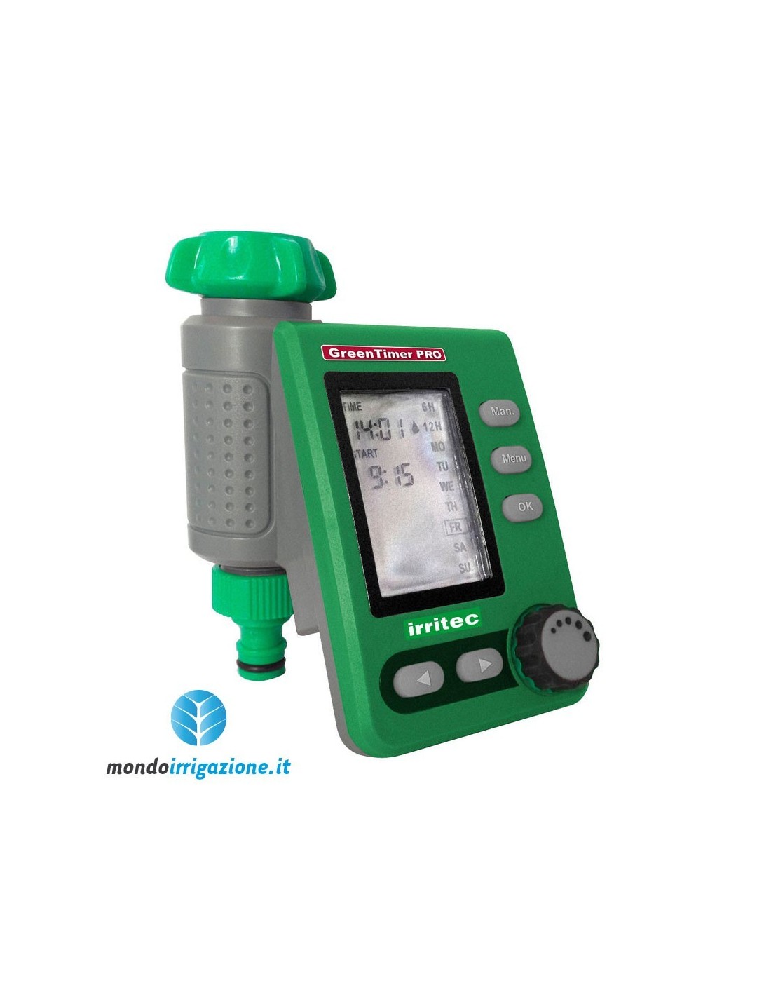 Curato nel design, ricco di funzioni, il programmatore a batteria Irritec GreenTimer PRO è proposto ad un prezzo estremamente competitivo. Non è indicato per installazione senza protezione dagli agenti atmosferici dato che non è un programmatore stagno. Per utilizzo outdoor o installazione a pozzetto è necessario un programmatore certificato IP68.