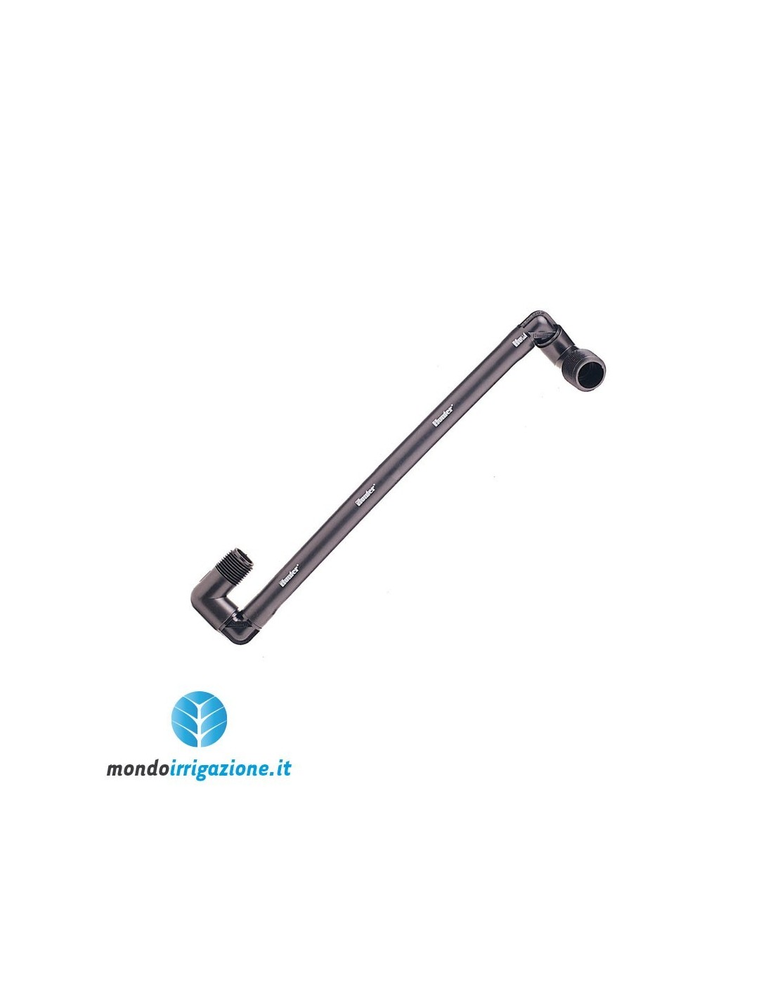 Il giunto snodato Hunter si avvita da un'estremità alla presa a staffa, e dall'altra direttamente sotto l'irrigatore. La lunghezze e lo snodo rendono possibile la regolazione e il posizionamento sia in altezza rispetto alla linea del prato, sia rispetto alla presa a staffa.