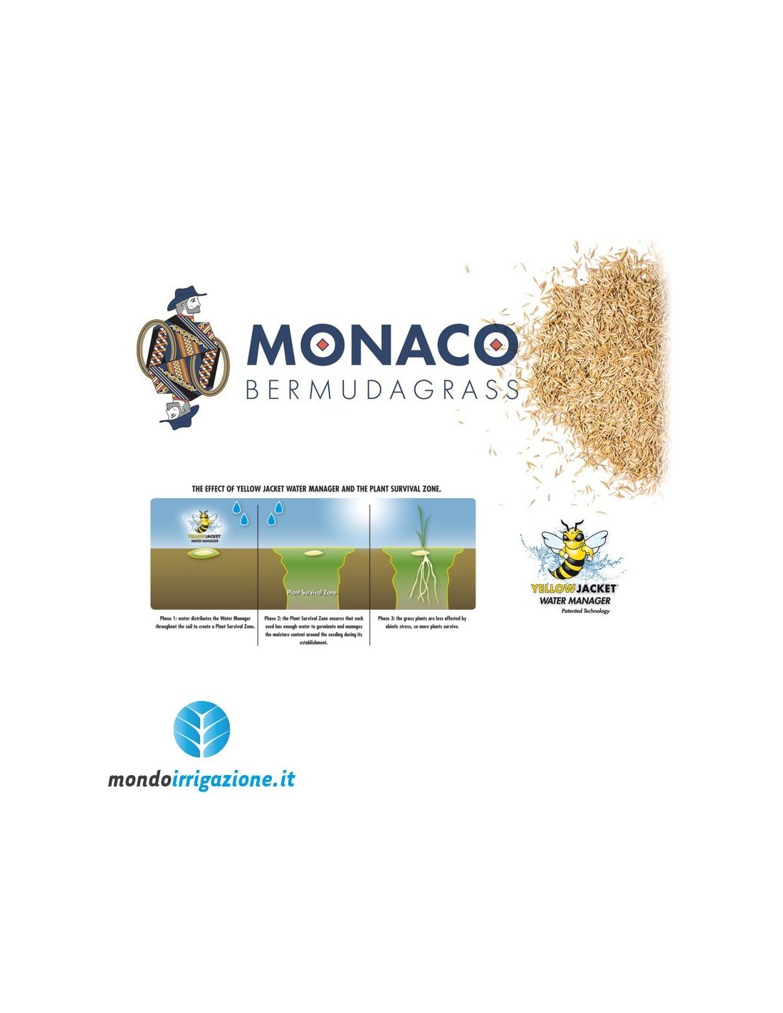 I semi di Bermuda Monaco sono confettati con una tecnologia rivoluzionaria, la Yellow Jacket Water, sviluppata da Barenbrug. Questa tecnologia riesce a creare una zona di sopravvivenza attorno alla pianta, che così ha risorse maggiori durante la delicata fase di insediamento.