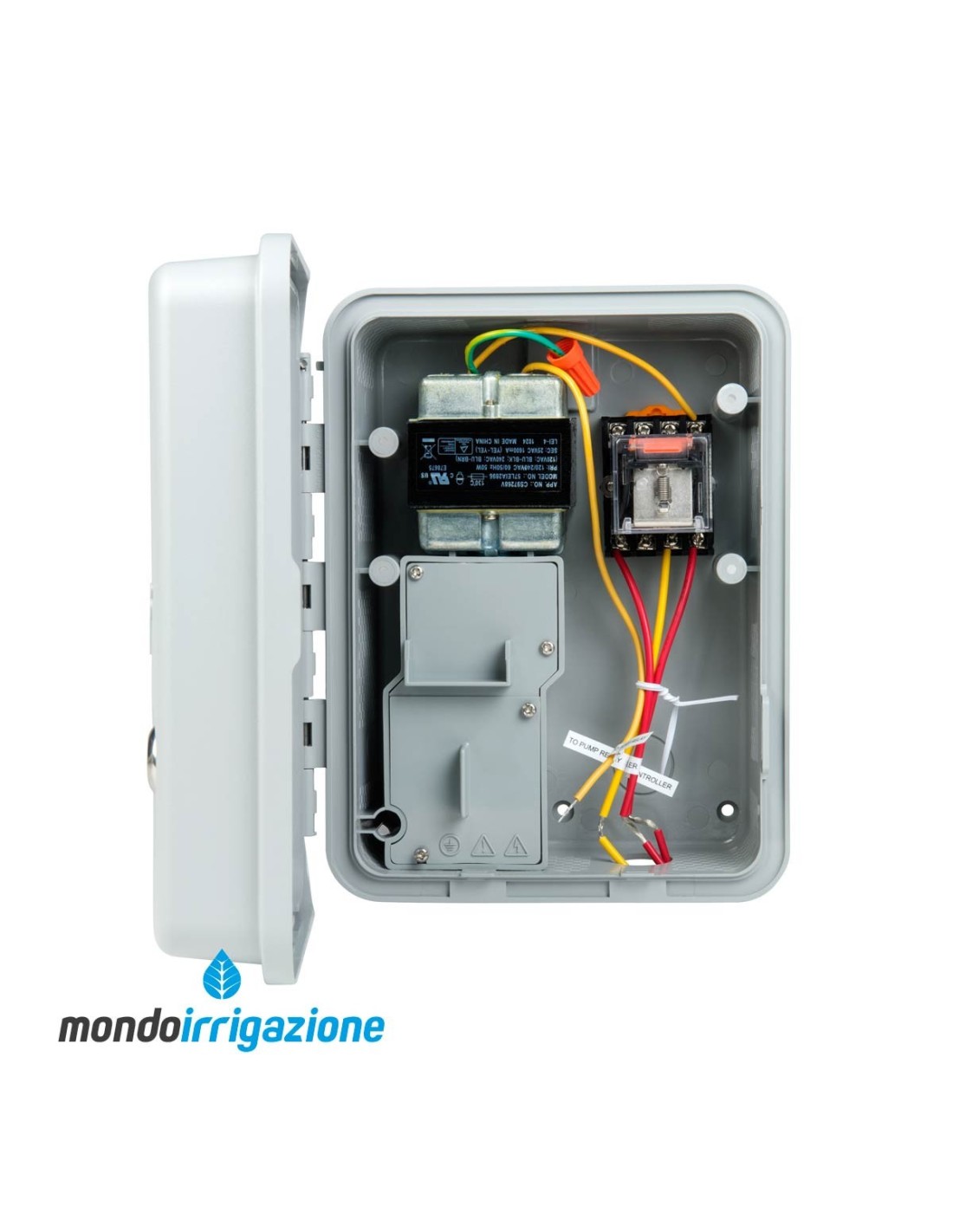 Il Relè avvio pompa Hunter PSR-22 è progettato per avviare una pompa, e si collega al comando pompa delle centraline per irrigazione tramite morsetti rapidi dedicati 24Vac.